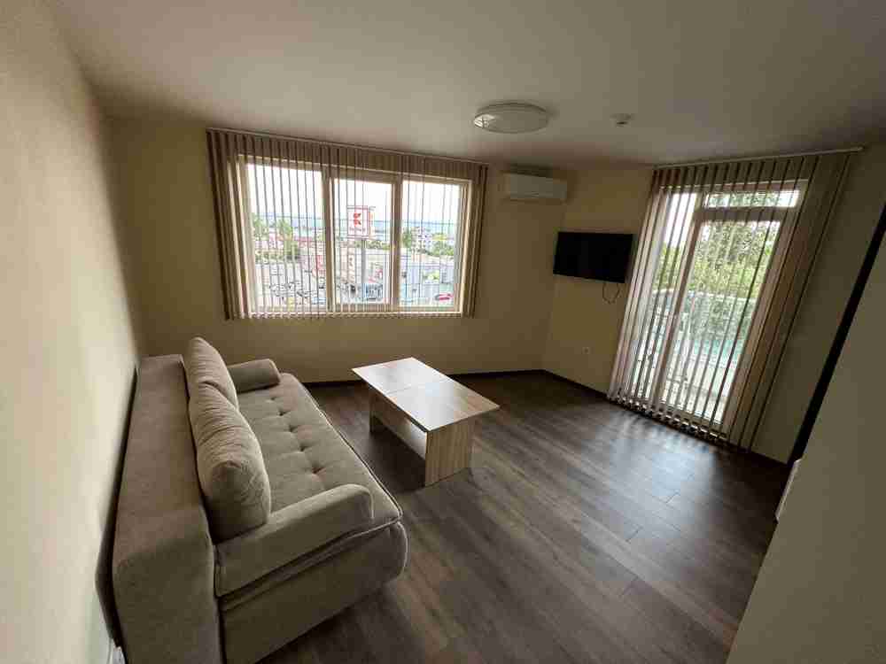 Апартаментът е светъл и уютен, разположен на 5-ти жилищен етаж и включва: входно антре, комфортен хол с разтегателен диван (тип спалня за двама), отделно обособен кухненски бокс, модерна баня с тоалетна и тераса.