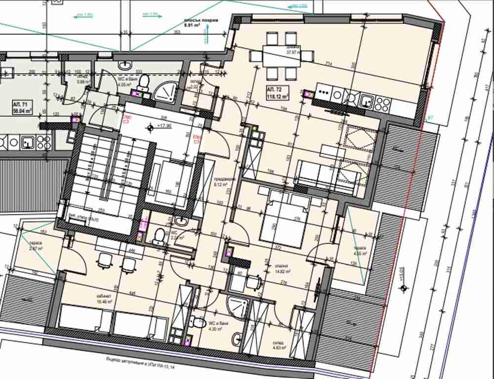 Апартамент 72 е с обща площ 135,16 кв.м., застроена площ 118,12кв.м. Разпрределение на имота - коридор (8,12 кв.м), дневна с кухненски бокс и склад (39,97 кв.м), две самостоятелни спални (14,82 кв.м и 16,48 кв.м), едната с дрешник (4,63 кв.м), две тераси (4,65 кв.м и 2,87 кв.м), баня с тоалетна (4, 30 кв.м), отделна тоалетна (2,24 кв.м). Отоплението е на ток. Апартаментите се предлагат в следната степен на завършеност: стени и тавани машинна шпакловка, подово покритие циментова замазка, ПВЦ дограма, блиндирани входни врати, ВиК положени тръби до тапа, отопление. Монтирани ел. ключове и ел. контакти, както и пълно окабеляване.