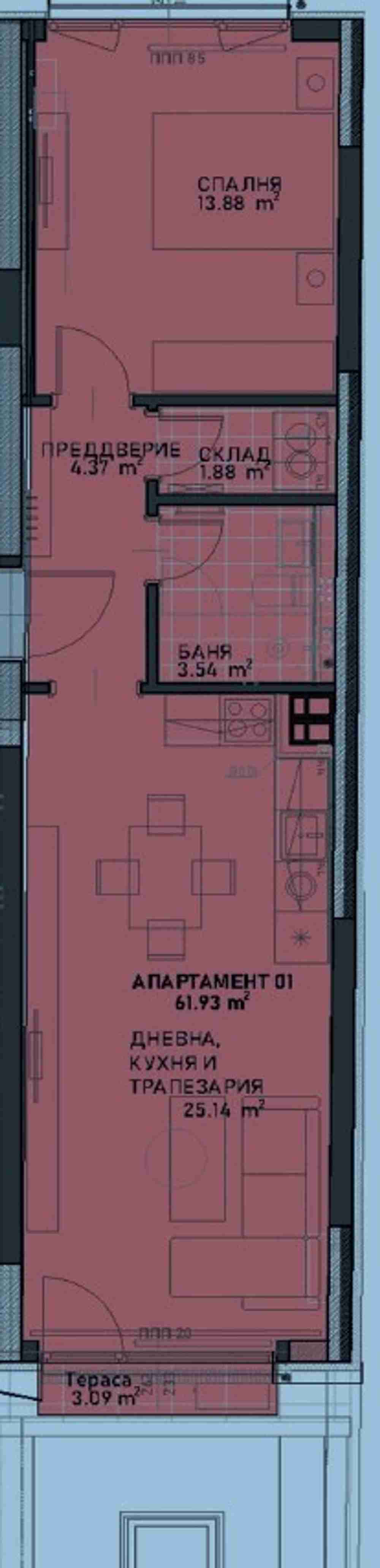 Предлагаме Ви двустаен апартамент в сградата. Обща площ 73.32кв.м. чиста площ 61.93кв.м.