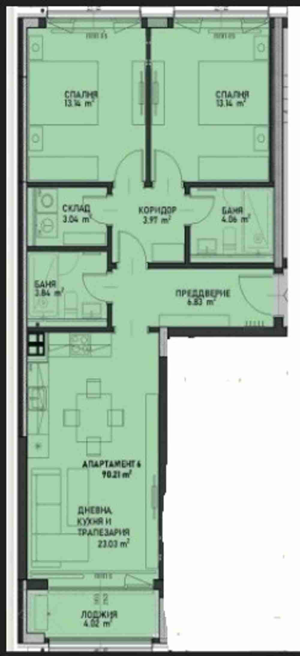 Предлагаме Ви тристаен апартамент в сградата. Обща площ 108.09кв.м. чиста площ 90.21кв.м.