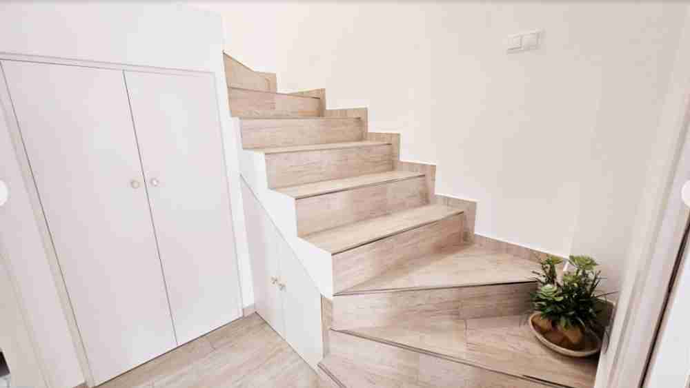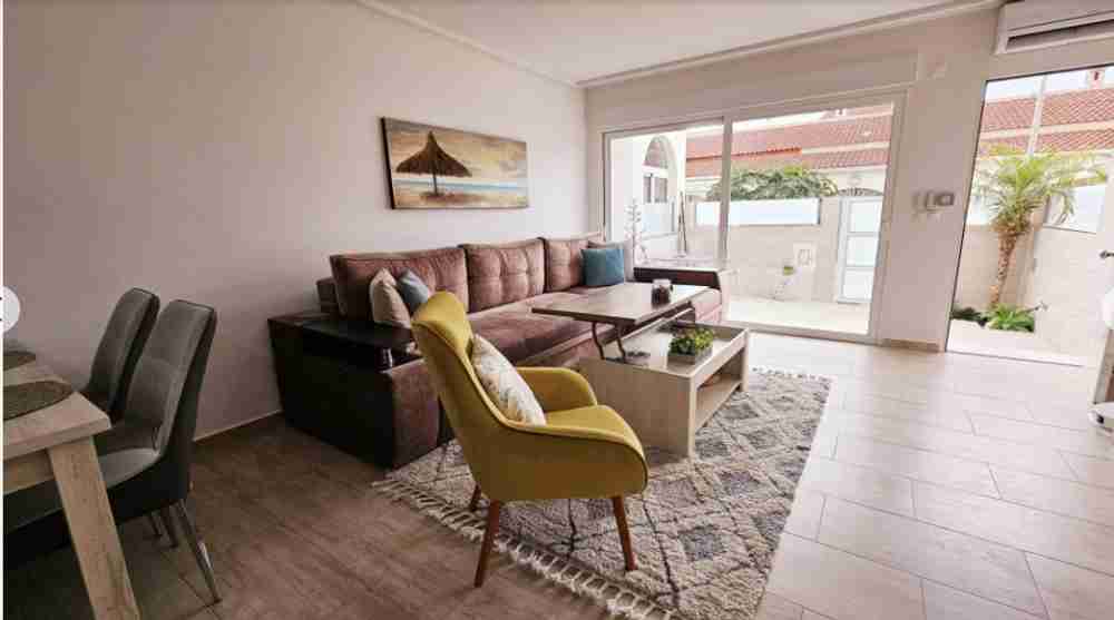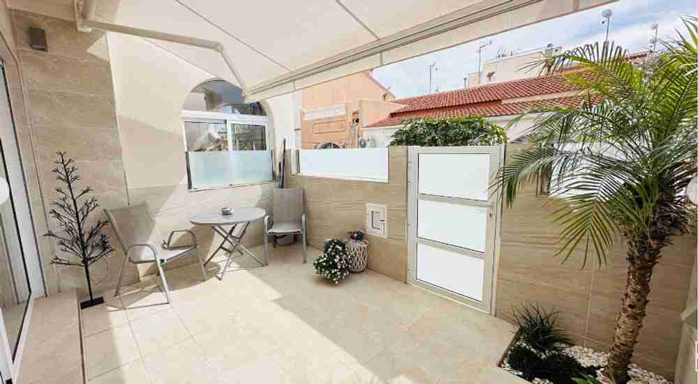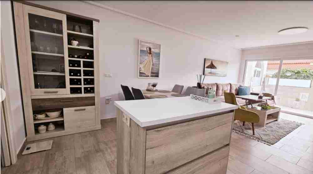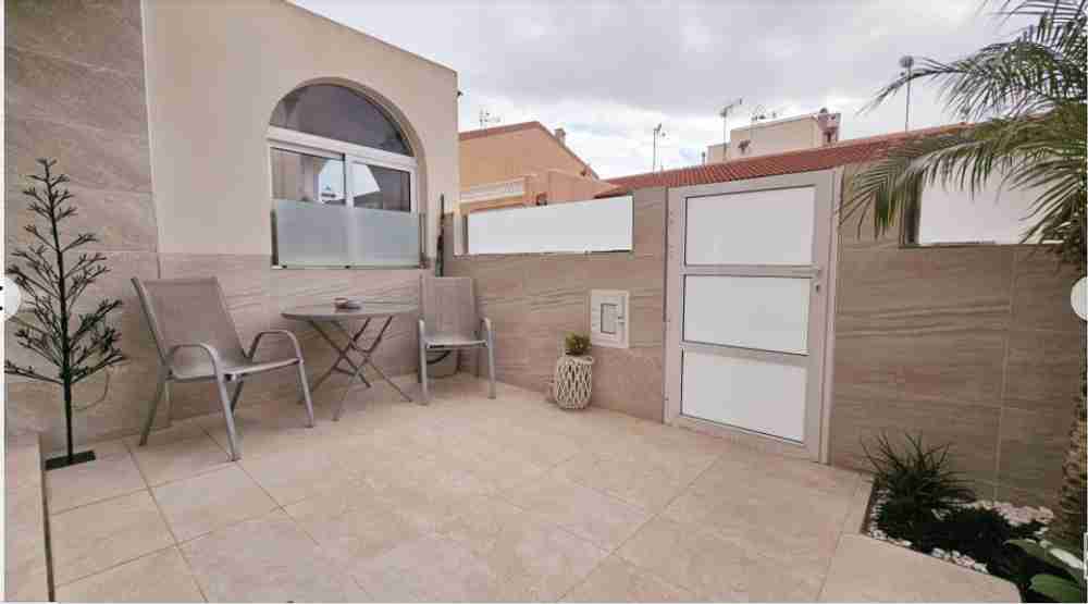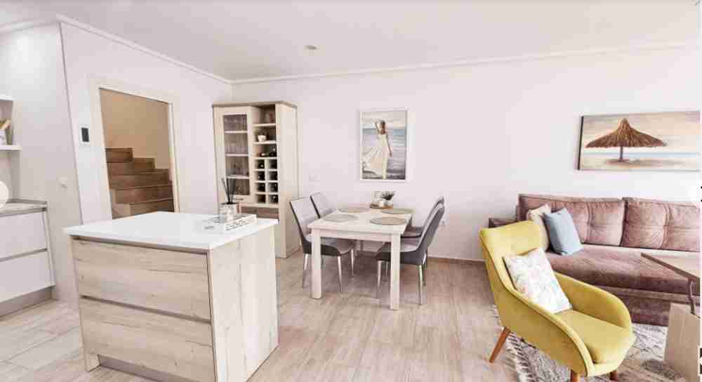 На первом этаже находится патио/терраса, ведущая в гостиную с обеденной зоной. Кухня и ванная комната также расположены на этом этаже. На верхнем этаже находятся две спальни с двуспальными кроватями, кондиционерами и ванная комната. Из главной спальни есть выход на террасу с видом. На третьем этаже находится прачечная и терраса с солярием площадью 45 м² с прекрасным видом на соляные равнины Торревьехи.